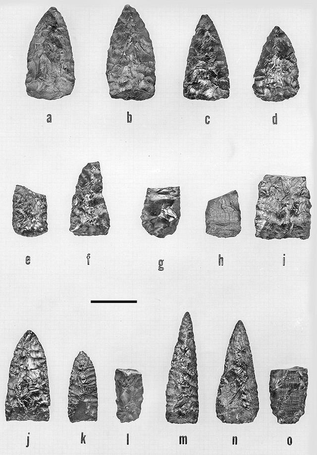 Semi-triangular points or knives: TYPE 1, a-d; Type 2, e-h; Style 1, m-n; Form 2, j-k. Lanceolate points or knives: Form 2, o; Form 3, w; Form l. Cultural Component VII, Subcomponent: VIIA, e, g-h; VIIH, c-d, f, l; VII-I, a-b, i-k, m, o; und., n. Cryptocrystalline silica, a-o.