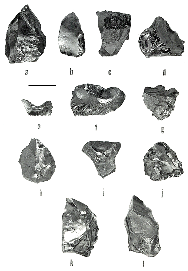 Type Variant 2D, a-d; Type Variant 3A, e-g; Style 3, h-j; Style 4, k-l. Cultural Component I, a,k ; Cultural Component III, g. Cultural Component VII, Subcomponent: VIIA, b-d, h; VIID, f, j; und., e, i, l. Cryptocrystalline silica, a-l.