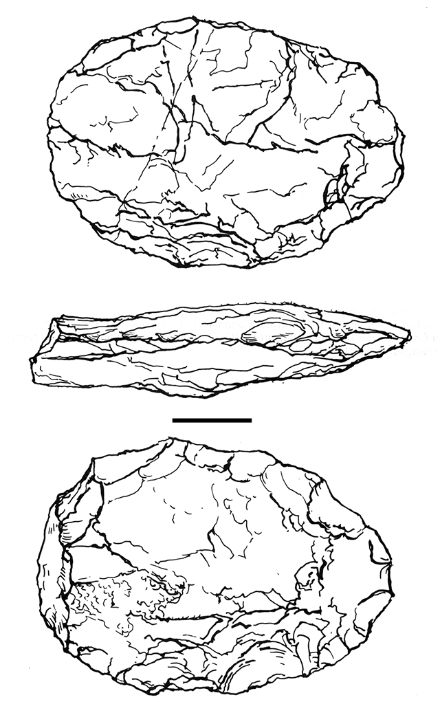 This specimen was recovered from a cache pit at the bottom of Stratum 5 in the House Pit 1 excavations. It lay outside the area of the house and therefore antedates Subcomponent VIIG. Material, cryptocrystalline silica.