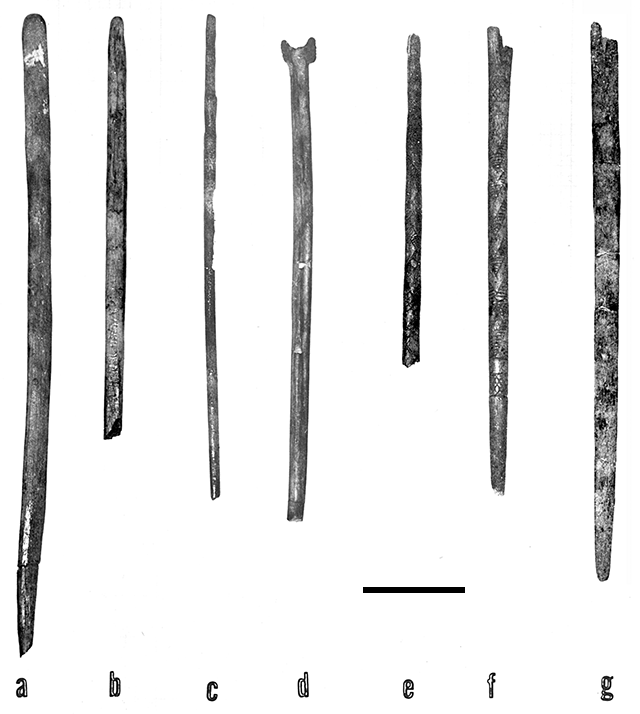 Cultural Component VII, Subcomponent: VIIB, g; VIIC, e-f; VIIH, a; und., d. Antler, a, d, f; bone, b-c, e, g.