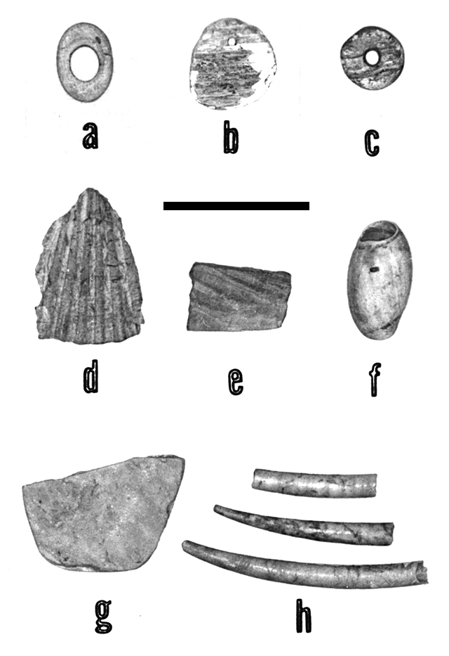 Shell ornaments of trade: Type 1, h; Type 2, f; Form 2, d; Form 3, g. Shell artifacts of utility, e. Shell artifacts of local manufacture: Type 1, c; Form 1, b; Form 2, a. Cultural Component VII, Subcomponent: VIIB, g; VIIC, h (top specimen), VIIG, e; VIIH, c-d, h (bottom specimen); VII-I, a-b, h (middle specimen); und., f.