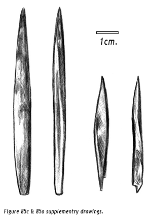 Technique of manufacture. Two distinct processes appear to be involved in the manufacture of these specimens. In the process most frequently used, the metapodia were cut longitudinally with a chipped stone knife or graver. The long, parallel-sided shaft which this produced than was sharpened at one end, after which final shaping and polishing were completed. In the second process, metapodia were split by fire cracking or adzing rather than cut and broken. Comments. None.