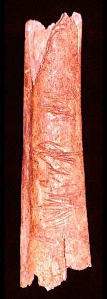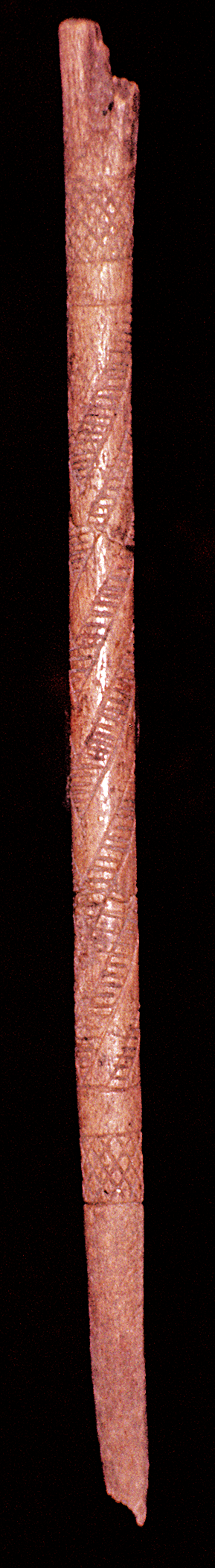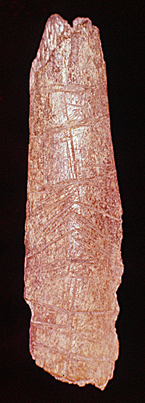 Style 2 Gambling Bones Decorated with Open Zigzags Number of Specimens. 1 Material. Mammal rib. Measurements and description. This specimen was well formed, having slightly excurvate edges and rounded extremities. One surface is decorated with opposing sets of diagonal lines or open zigzags. Unfortunately this specimen is fragmentary. Whole it would have measured 6.5 x 1.3 x 0.5 cm. Technique of manufacture. Grinding and incising. Comments. None.