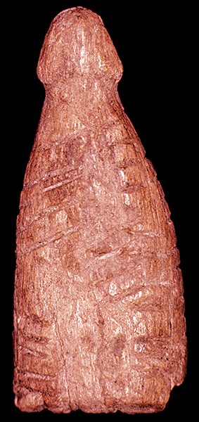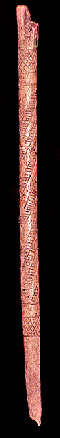 Digging Stick Handles (Figs. 86, a; 87). Two antler digging stick handles were recovered. One (Fig. 86, a and page header, above) antedates Subcomponent VIIG and is unusual only in that the tip of the tine is transversely grooved. The overall dimensions are 18.5 x 3.1 x 2.6 cm. The other specimen, from the floor of Subcomponent VIIB, measures 24.0 x 3.4 x 2.4 cm. It has been elaborately decorated with incised designs and may be seen in Figure 87. The design which appears on the larger specimen may be divided into the following elements: (1) circular lines used to divide the digging stick handle into segments and to border the major areas covered by the design; (2) design-filled zigzags formed by closely spaced parallel lines; (3) triangles, sometimes filled, which serve to terminate the zigzags; and (4) the use of lateral hatching as embellishment. The distribution of these elements in the Northwest is especially interesting. Fine lateral hatching used to embellish elements in straight-line geometrical design appears to be particularly common in the Salishan Plateau and neighboring costal area. From the Pot Holes, a site across the Columbia River from 45KT28, Crabtree (1957: Plate XXVII. a, f, design type 3) reports its use on Dentalia beads. He also illustrates an incised antler object (Plate XXVI, b) in which it is used as a bordering element in the same way it is used on the digging stick handle from Subcomponent VIIB. Farther north Collier, Hudson, and Ford (1942: Fig. 14, a) recovered the fragment of a digging stick handle on which this motif was used as a longitudinal bordering element. This specimen came from their site 46, about four miles south of the Canadian border. As both this site and the Pot Holes represent the very late prehistoric and early historic, the lateral hatch is a design element which must have been in common use along the Upper Columbia during the entire Cayuse Phase. Between the Canadian border and Lake Kamloops, some 110 miles to the north, there is a general hiatus of archaeological data. At Kamloops, however, the design again occurs as an element of decoration on a pipe bowl (Smith 1913:429). Moving into the Thompson-Fraser region, we see that Smith has reported three artifacts in which the lateral hatch is used (1899: Figs. 21 and 110; 1913: Plate XIV, i). He also reports (1899: 156-57) that some Thompson Indians of whom he inquired thought that this design might represent the wood-worm. There is also some evidence which suggests that the lateral hatch motif occasionally was used to decorate barbed bone points in the area of the Fraser River delta (Smith 1903) and on Puget Sound (Smith 1907: Fig. 141, b). [217/218] Other examples are comparatively rare. Heflin (1961) illustrates a tubular pipe from the Willamette Valley of Oregon on which there are incised bands of design-filled triangles identical to those which appear on the digging stick handle from Subcomponent VIIB. In addition there are two specimens from Wakemap Mound, one zoomorphic and the anthropomorphic, which contain this decorative element in the form of minor embellishments. The anthropomorphic figure has many counterparts recovered from the area of The Dalles, but to my knowledge no other is so decorated. This it should be noted, represents an extremely small percentage of the vast number of decorated objects taken from The Dalles locale and the entire Middle Columbia. It is an intriguing fact that the lateral hatch and the various motifs with which it was combined have a distribution which coincides rather closely with the ethnographic distribution of Salishan speaking peoples. No specimens have been reported from Sahaptin areas, and the two specimens reported from Wakemap Mound, a site which is probably Chinookan, have used the design in a different manner.