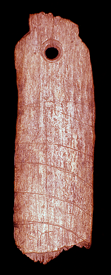 Form 3 Triangular Antler Pendant (Fig. 93, o) Number of Specimens. 1 Material. Antler. Measurements and description. This specimen is shaped roughly like an isosceles triangle whose apex has been pulled into a small knob. It is decorated with diagonal lines on the obverse and closely spaced transverse lines around its perimeter. It measures 3.9 x 1.7 x 0.7 cm. Technique of manufacture. Grinding and incising. Comments. None.