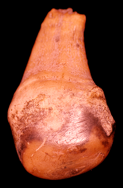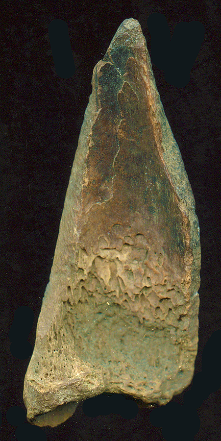 Form 2 Shaved Antler Beam Flaker Number of Specimens. 1 Material. Antler. Measurements and description. This specimen consists of the proximal end of an antler which has been diagonally shaved to a blunt point and then utilized as a flaker. It measures 15.3 x 4.5 x 4.0 cm. [221/222] Technique of manufacture. Adzing and shaving. Comments. None.
