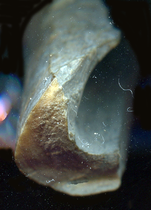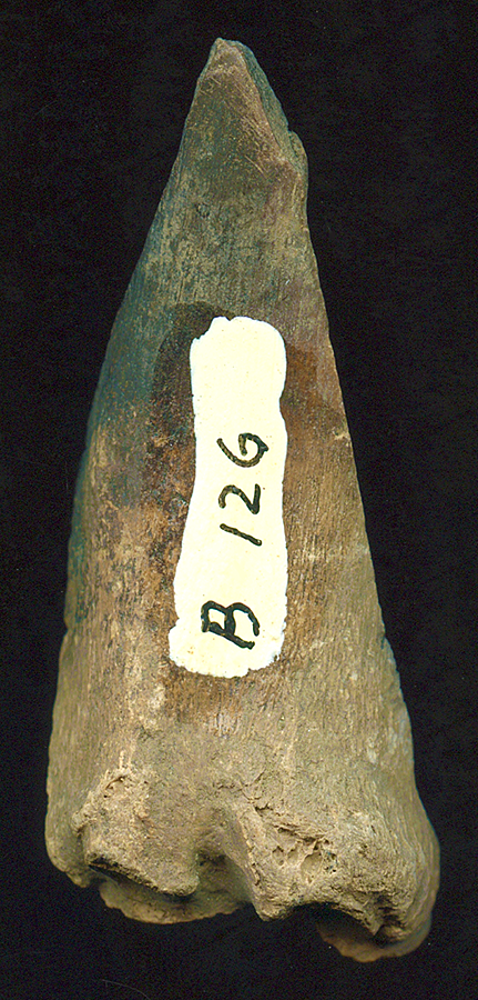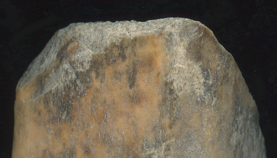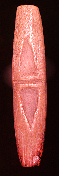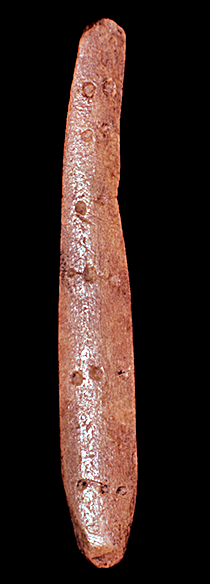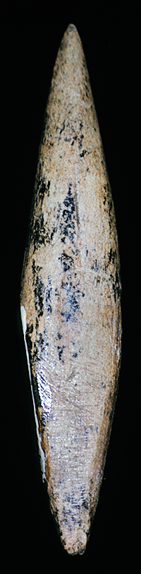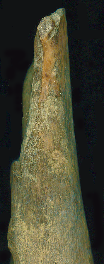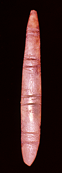 Form 2 Awl of Split Bird or Rodent Bone (Fig. 81, c) [see Note 10] Number of Specimens. 1 Material. Bird or rodent bone. Measurements and description. Measuring 5.3 x 0.45 x. 0.2 cm., this specimen is narrow and parallel-sided, with smooth edges and a blunt tip. Technique of manufacture. This specimen appears to have been altered slightly through grinding. It also has been worn heavily through use. Comments. None. [207/208] 45KT28/2335. VIIA. This specimen is actually a tine from a basketry comb. As can be seen below, the medulary canal of the split bone has been filled with a pinkish "paste" which probably accumulated as the comb was used and is most likely residue composed partly of a hair preparation. ![]() Click on image for close-up.