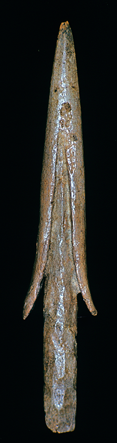 Style 2 Bipointed Bone Projectile Point (Fig. 85, h) Number of Specimens. 1 Material. Bone. [214/215] Measurements and description. This specimen is a long, slender, bipointed bone point with an ovate cross section. It measures 8.6 x 0.5 x 0.35 cm. Technique of manufacture. This specimen was blocked out by means of cutting with a chipped stone knife or graver and finished by grinding and polishing. Comments. None.