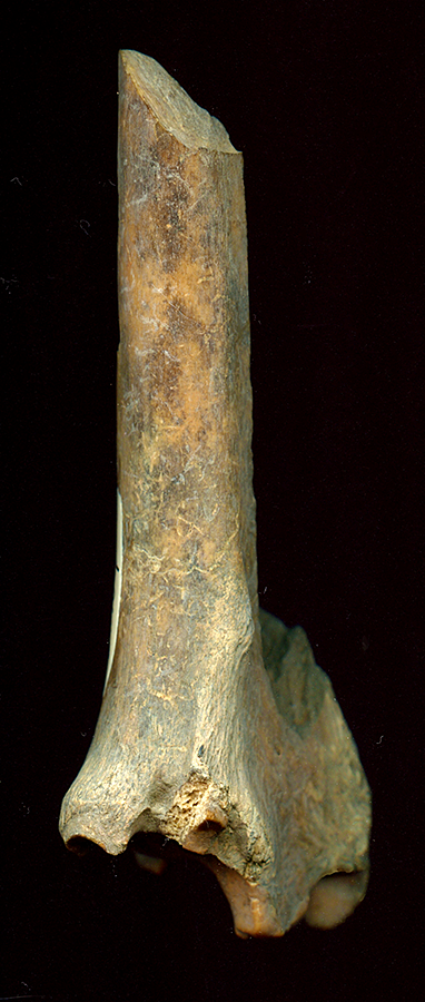 Style 1 Ulna Awl (Fig. 81, b) Number of Specimens. 1 Material. Ulna, probably that of a carnivore. Measurements and description. This specimen possesses the outline of all regular ulna awls. The proximal end of the ulna forms the handle, while the central portion of the shaft has been cut and sharpened to form the awl's tip. This specimen measures 9.8 x 1.8 x 1.2 cm. [206/207] Technique of manufacture. This specimen was manufactured by cutting the central portion of the shaft in a diagonal direction by means of a chipped stone knife or graver. This point was sharpened through grinding, and the proximal termination of the ulna was battered to provide a comfortable handle. Comments. None.