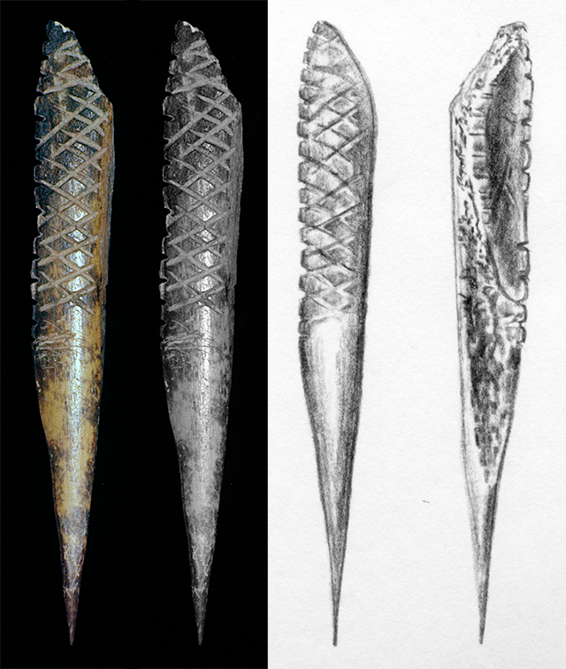 As usual, the last nod goes to Dr. David Rice, who had the foresight to warehouse all of the editorial material from the publication process, including the negatives and enlargements that have been used in reproducing the photographic figures. Thank you one and all. Your hard work has made it possible for me to create the web pages that are at the heart of this web presentation of 45KT28, the Sunset Creek Site. The Drawings of Delmar NordquistAll of the artifact drawings, including the cover illustration, were provided by Delmar (Del) Nordquist, a charter member of the Washington Archaeological Society and one of the primary illustrators contributing to the Washington Archaeologist. Artifact illustration is an art in the service of science. The interpretive aspects of this art are ment to accentuate details that aid in the interpretation of an object without distorting its visual form to any great degree. The extent to which Del succeeded in this balancing act can be judged from the image below, which compares a photographic image, in color and grayscale, with his drawing of it.