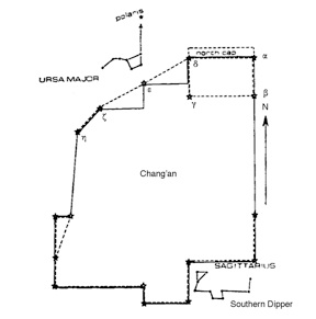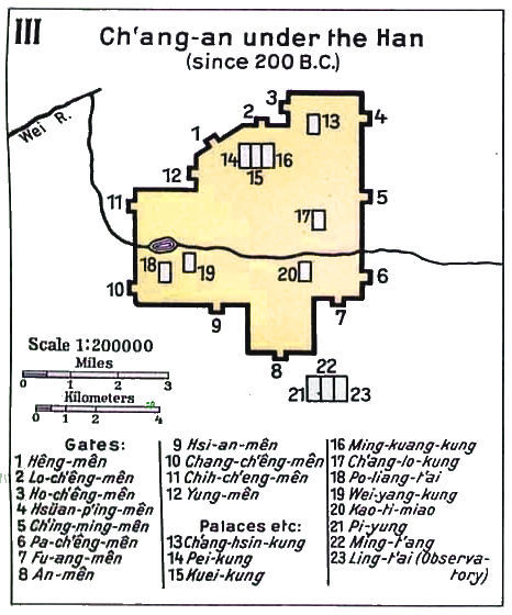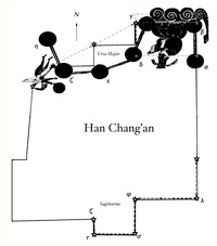 ![]() The Han capitol at Chang'an showing tombs placed to align with features in the capitol at a distance of about seven miles. |