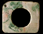 Now here we have a Neolithic ts'ung, in this case a thin, rectangular disc with a circular hole in the center. This form of ts'ung is quite uncommon. The ancient texts speak of bi and ts'ung in the same breath. While bi are used to address Heaven, ts'ung address gods that reside in the Earth, and especially the god that intercedes with one's ancestors. So perhaps the design on the burial pot above invokes a gateway to one's ancestors. |