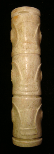 Early and middle Neolithic ts'ung come in the form of tubes that are segmented as though you were stacking disc-shaped bi on top of one another. Hence, they may be circular, but are decorated on the sides with a representation of the "Taotai." |