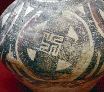 This is a Middle Neolithic pottery vessel created more than a thousand years before the earliest of the Chinese states arose. Notice that our square of nine squares is truncated and bounded by a series of circles. Similar designs from more recent times and accompanied by written records, tell us that these circles represent the heavens, so in this context we may deduce that our square of nine represents the world - quite literally the earth. What then means the swastika in the Center square? Have you ever wondered why the swastika is a symbol found in the art of the vast majority of cultures in the northern hemisphere? |