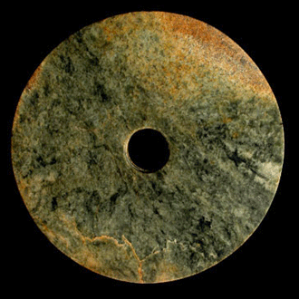 The design on the vessel above is also reminiscent of this jade bi. Bi may be perforated discs, such as this one, which is unusually large, with a diameter of 17 inches, or they be circular tubes decorated on the exterior. According to the oldest surviving records, these were used to send prayers and supplications to the court of the Jade Emperor in Heaven. |