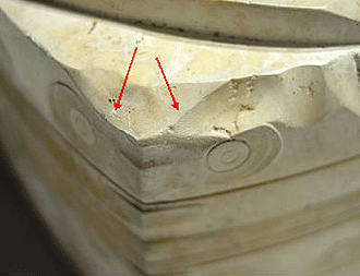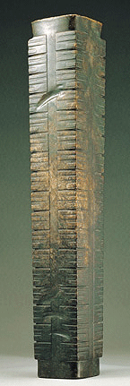 More complex Neolithic tombs often contained multi-teared ts'ung, in this example a 17 tier masterpiece. These are reminiscent of the generational chain of being that underlies ancestor worship throughout the orient. Do the tiers evoke generations of the dead; if so, how many? |