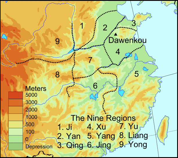 We're going to skip over cities and their elements for a moment, and jump to the level of the nation. The oldest extant texts tell us that the first Emperor of China ruled over Nine Provinces or regions having the names listed in this figure. Although the names are referred to the correct geographic positions, they are not numbered correctly, that is in accordance with Chinese cosmology. How would you renumber them applying the principles inherent in the diagram at the top of this page? |