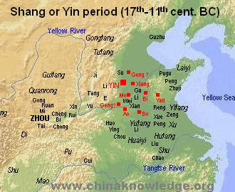 This is a map that shows the location of the Shang and their neighbors. The Zhou were allies of the Shang, but later defeated them in a war, taking the Mandate of Heaven from them to become the rulers of China. More on this elsewhere. For now, simply compare this map with the one above to see the territory that both the Shang and the Zhou aspired to rule. |