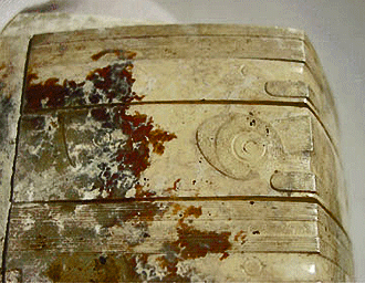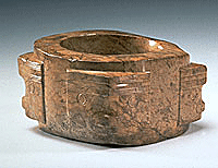 More typical of Neolithic ts'ung, in this one-tier ts'ung, which is a short tube surrounded by a rectangle whose corners have been turned into carved faces. These faces may represent the face of the god who intercedes on one's behalf with the dead, or the the "Tao Tie" "monster" face common on bronzes; these might even refer to the same being. |