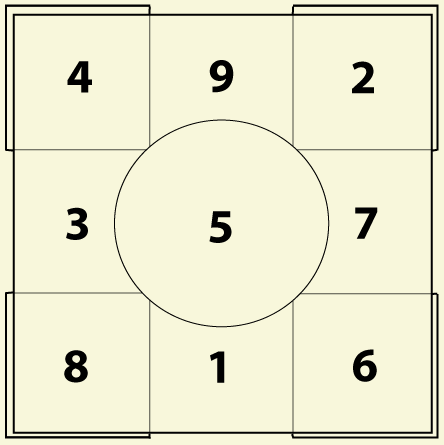 This diagram of nine squares-within-a-square, and three simple concepts, form the basis for the traditional Chinese cosmos. It is used to represent a variety of systems including astrology, solar and lunar phases, and architectural, political, and religions geography and architecture. The Center is the subject of the system, the Inside space of eight squares represents the means through which the subject acts, and the Outside, consisting of the twelve outer edges of the eight inner squares, are amplifications of their qualities. In geographic and architectural situations, North is outside the top of square 9, but for astrology and some other applications, it appears outside the bottom of square 1. What is the cosmological reasoning for this? Why are the squares numbered in this esoteric manner? Why is 5 in the center? |