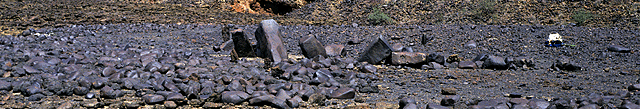The Lothagam Pillar Site is situated on a wave-cut terrace in the valley between Lothagam's twin ridges, near the base of the western ridge, approximately where the red dot appears in this Google Earth image. At the time of the site's creation, Lake Turkana was higher and Lothagam was most likely a peninsula. Thus, the site commanded views out over open water to the east and north. As at Jarigole, the cemetery was constructed on a recessional beach whose gravel was used in making the platforms that cover the graves. At Lothagam, however, the beach includes much larger and better-rounded cobbles than the beach in the comparable geomorphic position at Jarigole. This may imply prevailing winds from the east or northeast.
