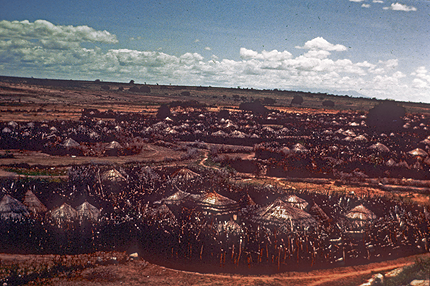 6. Stockade ? This is a Karamajong village, ca. 1960, in northern Uganda, about 200 miles SW of Kalokol. Notice the high stockade that is used to protect the village. In general, East African pastoralists put stockades or thorn fences around anything that they value. If that occurred at Kalokol, the view of the horizon would have been obstructed by the fence. | ![]() |