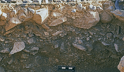 On top of the beach, a platform has been constructed by carrying in small boulders, cobbles, gravel and dirt. Here, at Jarigole, it is 20 cm. thick and a light brown due to the slit and clay that it contains. Such platforms are characteristic of Namoratunga architecture. |