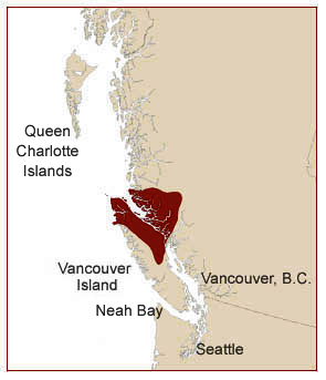 To the left are the principle groups the Northwest Coast societies. The Kwakiutl are situated in two places - in northern and southern territories separated by the Bella Coola, as shown on the map below. On the map just above, the brick red area marks the southern Kwakiutl, of Kwakwakawakw. This is the area in which the Cannibal Woman Society and its ceremonies are most elaborated. The material used in this presentation is drawn mainly from the Kwakiutl and adjacent societies. Home |