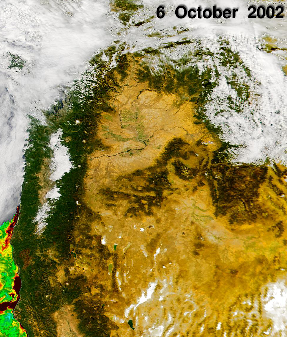 Pacific Northwest showing a storm system that illustrates the rain shadow created by the Cascade Mountains.   Click on image to enlarge.