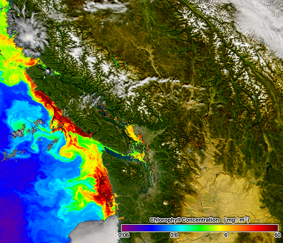 Pacific Northwest showing the chlorophyll content of coastal waters during the fall. This reflects the upwelling of nutrients, one of the reasons that the Northwest Coast has such abundant marine and intertidal resources.   Click on image to enlarge.