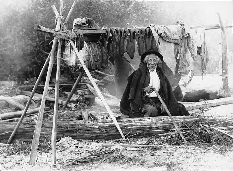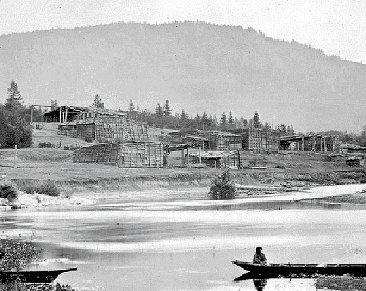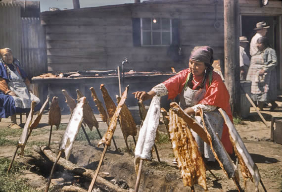 Upper right: Fish weir at Quamichan Village on the Cowichan River, Vancouver Island, c. 1866. Lower right: Tulalip smoking salmon, 1906. Below: Cooking salmon for a feast somewhere on the Mid-Columbia River.