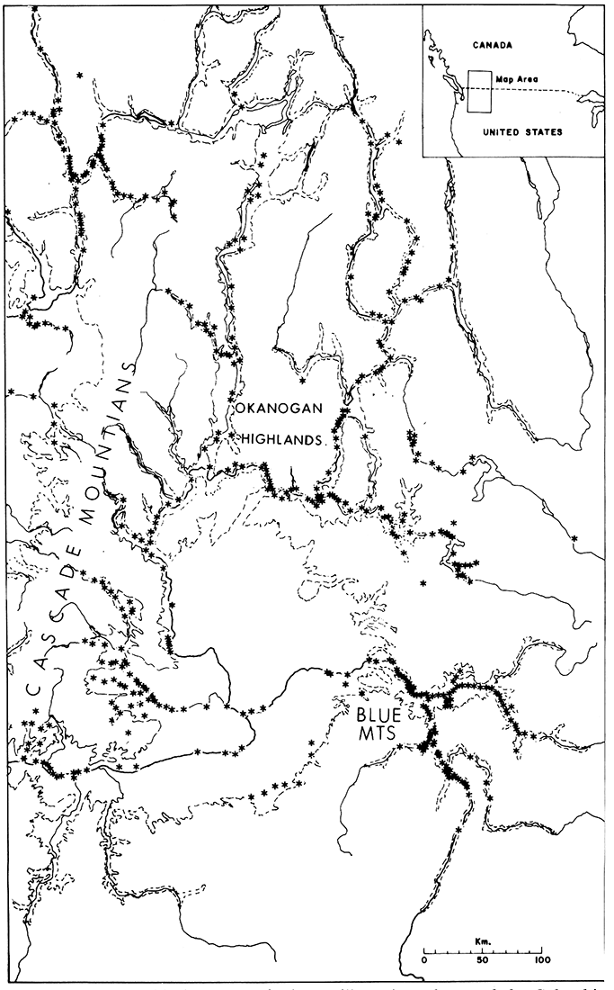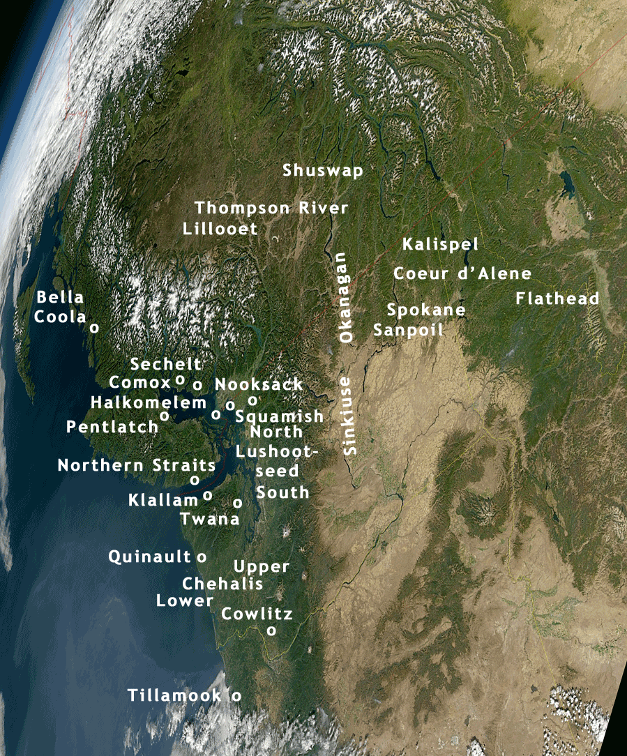 Pacific Northwest showing the lands in the greater Puget Sound region and the northern Columbia Plateau that came to be occupied by groups speaking Salish languages.