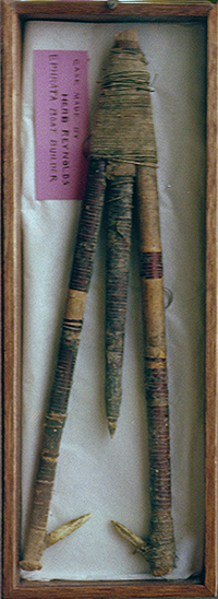 (right) Three-pronged salmon spear from Whiskey Dick Rock Shelter north of Vantage, WA. Bone components from 45KT28, a few miles north of Whiskey Dick. (below) Leister spear replica by archaeologist Martin Lominy (See Martin's work at Mayafiles).
