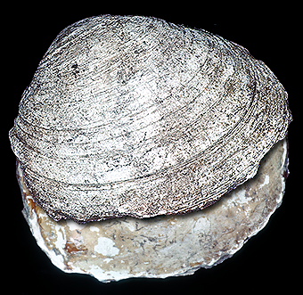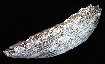 Shell scraper from Fishtown (45SK33), made by flaking the edge of a Washington Clam (Saxidomus nuttalli). The brown stain on the edge is a residue acquired through scraping. |