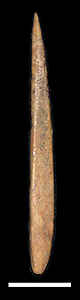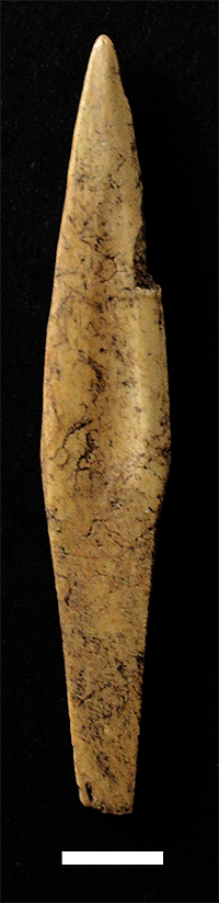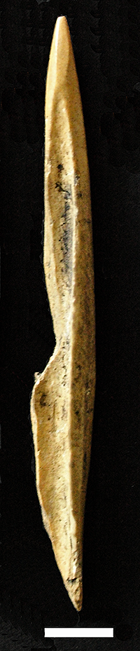 Above. Highly finished metapodial awl or point from Fishtown (45SK33). Left. Minimally finished awl from a splinter of long bone. Musquium. White bar is 1 cm. |