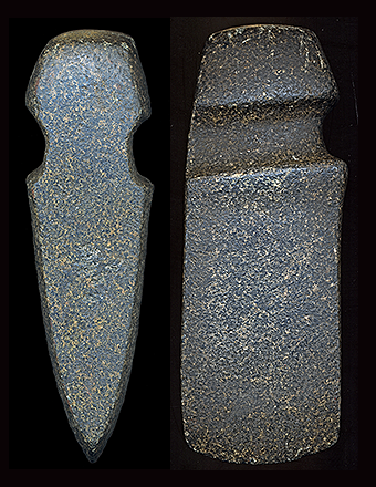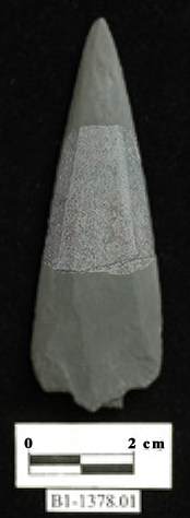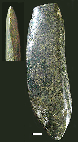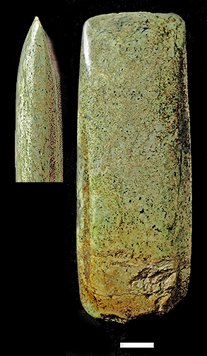 Nephrite adze. An adze, also called a celt, has a gently domed upper surface, a flat lower surface and an asymmetrically beveled cutting edge, or bit. The base is often pointed or rounded to accommodate hafting. The White bar is 1 cm.