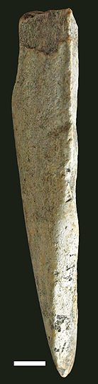 Ground slate tool from Fishtown (45SK33). Possibly a bark shredder designed to be hafted in a wooden handle at the top. Scale is in cm.