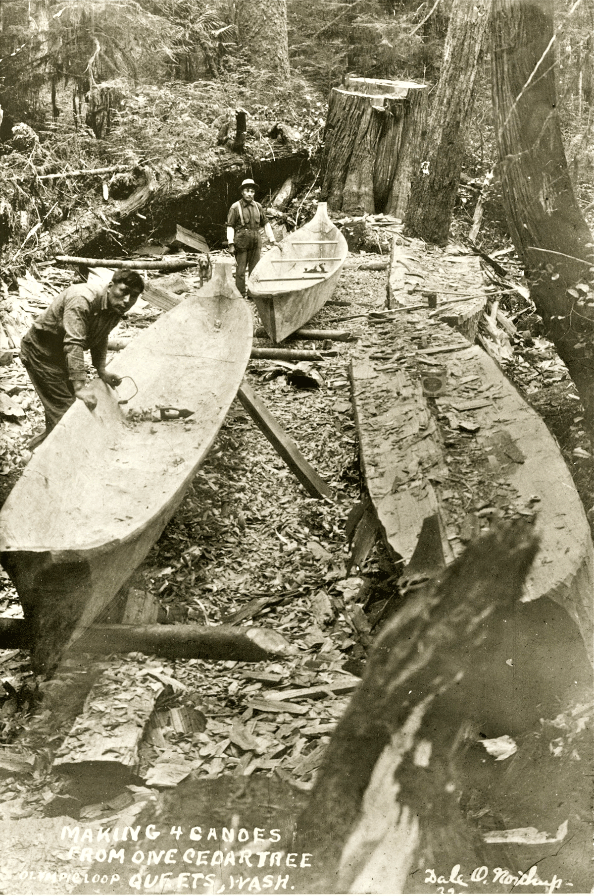 •NEW• Four canoes being made from a single red cedar log by Queets boat builders on the Olympic Peninsula. If you enlarge the picture by clicking one, you can better see exactly what they are doing. |