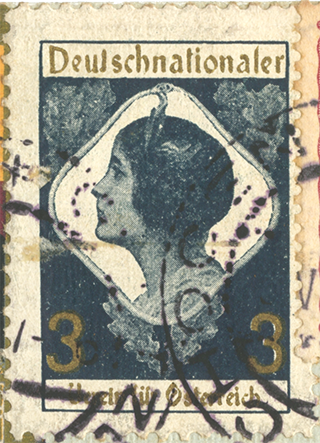 Though the wanderer in the poem is initially identified as being male, it is a woman wearing an impractical garment who is shown descending to the spring of peace in search of renewal. Happily, her feet are large and built for the journey. On the address side of the card, Eman uses a label of the Deutschnationaler Verein für Österreich (German National Association for Austria) that pictures a woman in a then modern hair style. The oak leaf embellishments around the portrait leave little doubt that the lady represented is Germania, the feminine embodiment of German culture and nationalism. The implication is that the lady on the front of the card also represents Germania, in her most open and vulnerable form, in search of the spring of peace on behalf of the entire Germanic world. Germania in the context of Eman's work. |