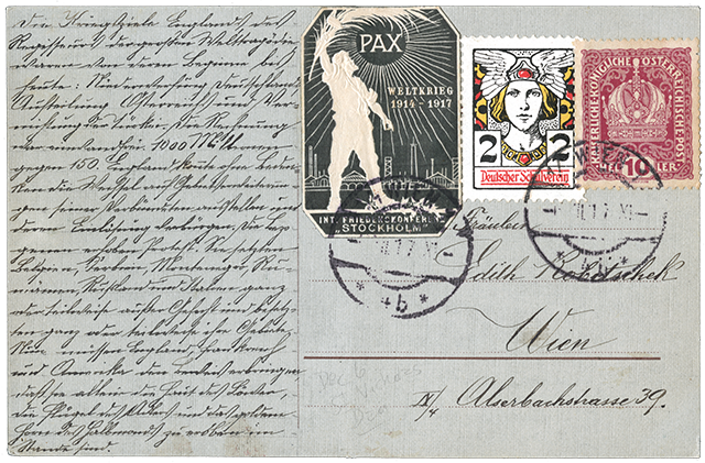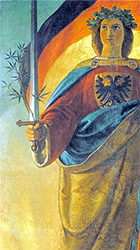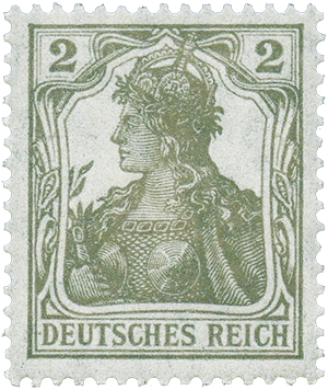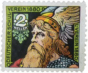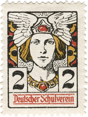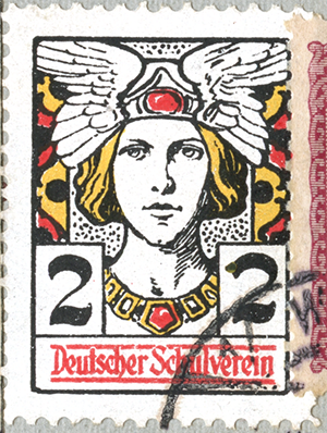 EMAN'S USE OF GERMANIA Eman uses the Deutscher Schulverein stamp that depicts Germania, the female spirit and guardian of Germanic peoples, to emphasize his message that the German people are peaceful by nature and, if heeded, would end the war. Although Germania, wearing her battle armor, was adopted as an official symbol of Germany, proper, where she adorned their postage stamps beginning in 1900 (used throughout WWI).