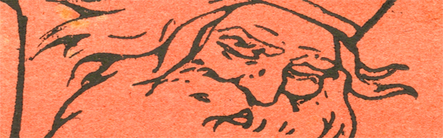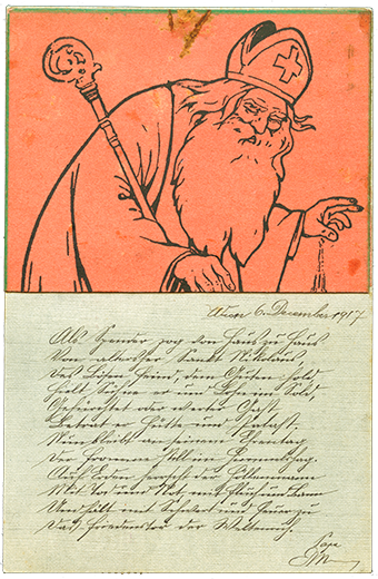 Christmas - 1917. St. Nicholas has retired to "heaven's grove" and there is no Christmas on Earth. Instead, the "man from Hell" holds forth, fanning the flames of war and baring the gate of peace. The essay on the other side of the card makes it clear that Eman believes that the man from Hell is none other than the King of England.