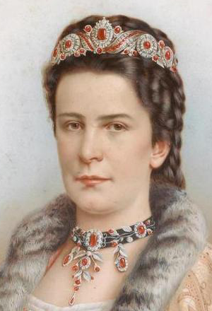 On the other hand, in the propaganda label, Germania is wearing Thor's helmet suggesting that she's no pushover. GERMANIA AND THE ART OF PROPAGANDA From the 1850s onwards, advertising, propaganda and gazettes had been developing a very sophisticated system of social and political symbols that made it possible to pack a complex, potent message into a very small visual space such as the propaganda label we are discussing here. If you click on the Schulverein label above left, it will open a separate image that you can compare side by side with the images below. The image at the left is of the Empress Sisi (Elisabeth), the wife of Emperor Franz Joseph, taken from a painting done in her middle years when her face has begun to fill out. When younger, her face was more heart-shaped like that in the label. Note, too, the red jewelry, which she frequently wore for formal occasions and which finds its echo in the propaganda label. Sisi was very popular both then and now. She detested being Empress, lost her daughter in tragic circumstances, and was struck down by an assassin in 1898. Echoing her image was bound to engage the empathy of the viewer. READ A BRIEF BIOGRAPHY OF SISI.