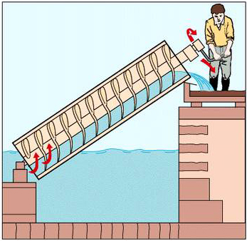 Archimedes Screw drawing and one under construction using traditional materials in Egypt. |