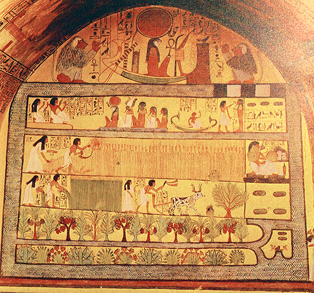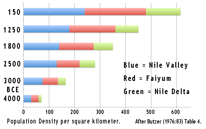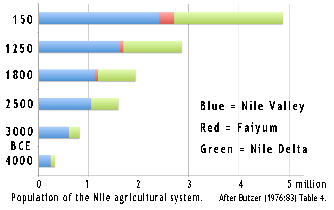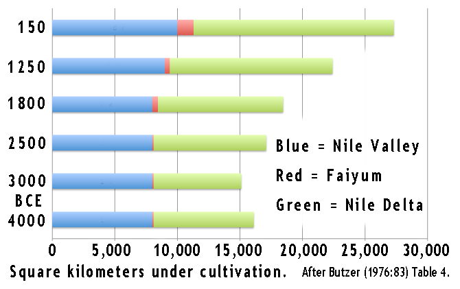 The growth of cultivation in the Nile Valley from 4000 to 150 BCE, measured in square kilometers. Notice that the entire lower Nile system system was under cultivation well before the unification of Egypt, around 3200 BCE. |