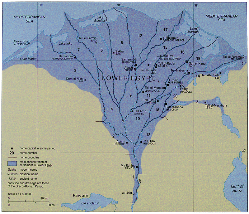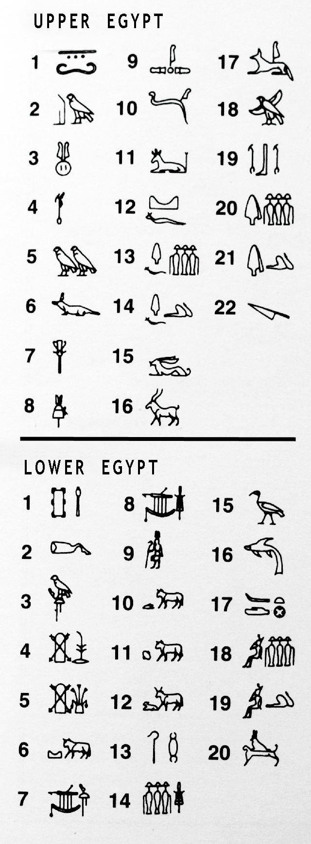 Ensigns by which we know the nomes of Egypt. Nomes in Lower Egypt were very fluid and did not stabilize into this list of 20 until the Roman period. Nomes in Upper Egypt became fixed by the 5th Dynasty and remained relatively stable thereafter. |