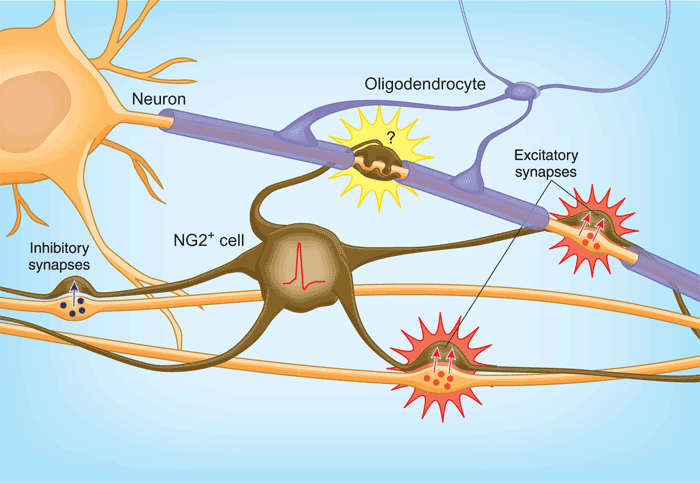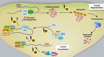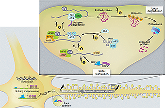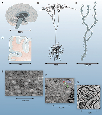 This shows the soma (body) of the neuron and one of the dendrites, which is studded with "spines," each topped with a synapse connecting it with another nerve cell. One form of communication between the soma and a single spine is shown in this drawing. |