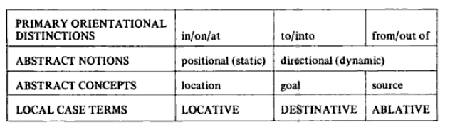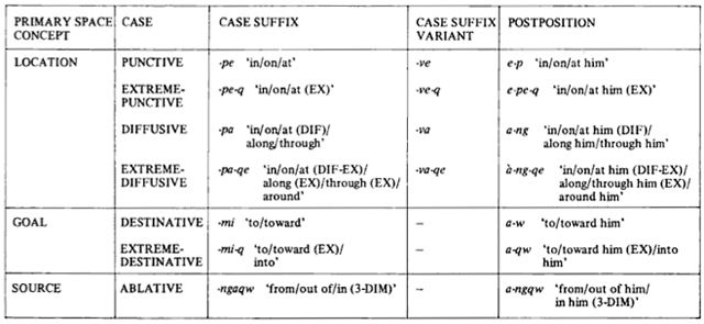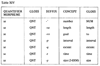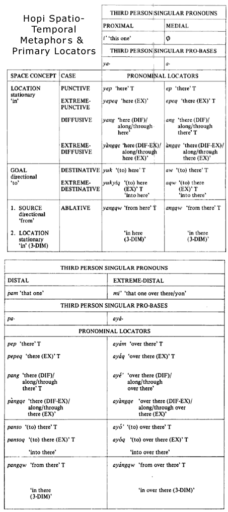 The following tables have been taken from Hopi time: a linguistic analysis of the temporal concepts in the Hopi language, By Ekkehart Malotki. Notice how much depends on metaphor and how little on direct reference to temporal categories.