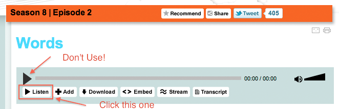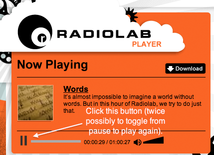 The default interface for the RadioLab audio is seen below in Figure 1. On some devices, when the play button is selected there is no audio and the browser may crash when the play button is left "on". If this happens, begin again from scratch. Reload the Radiolab page. Do not use the triangular play button. Instead, select the "Listen" tab just below the play button.