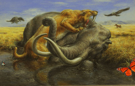 The Monarch has the ability to spray a cloud of toxic scales into the nose of any bird which tries to eat it. This ability, we are now told, evolved in part as a defense mechanism against elephants who found butterflies of the Monarch family to be alluring as cat nip is to most cats. Indeed, the trunk of the elephant evolved partly to suck Monarchs out of the boughs of the trees where they congregate. Unfortunately for the Monarch, the elephant's trunk technology evolved more rapidly than the Monarch's biochemical defense mechanism. The development of a migration pattern which congregated Monarchs in a small portion of the elephant's total range was a further adaptation, but only partially effective due to the gluttonous apatite of pachyderms. Things might have gone badly for the Monarch but for Smilodon, the only natural predator of the elephant. Monarchs learned to light out on water vegetation at the margins of large ponds and lakes, and on the tar ponds of the La Brea. The elephant would come to the edge of the lake, or the tar pit, and stretch out its trunk in an effort to vacuum in a butterfly or two. A bit to close and the butterfly retreats a bit. Just a little further -- just a stretch of the trunk and ... Smilodon fatalis pounces, sinking his enormous sabers into the hapless pachyderm, and the Monarchs fly happily about their business. The elephant became extinct in the Americas as Smilodon gave way to the Mountain Lion, but the Monarchs fly on happily, a living memorial to the king of beasts. | |