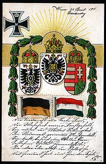 Papa Robitschek has modified this off-the-shelf patriotic card by adding the appropriate flag labels below the coats of arms and the sliver cross label at the upper left. This suggests that the card was carefully selected for its image, which places Austria at the heart of the Germanic world. Although the card appears, at first blush, to be about the War, this is not its primary concern. Rather, it is about being german and the tide of history, which is sweeping away the Austria of old and its ability to define the highest ideals of Germanic civilization.